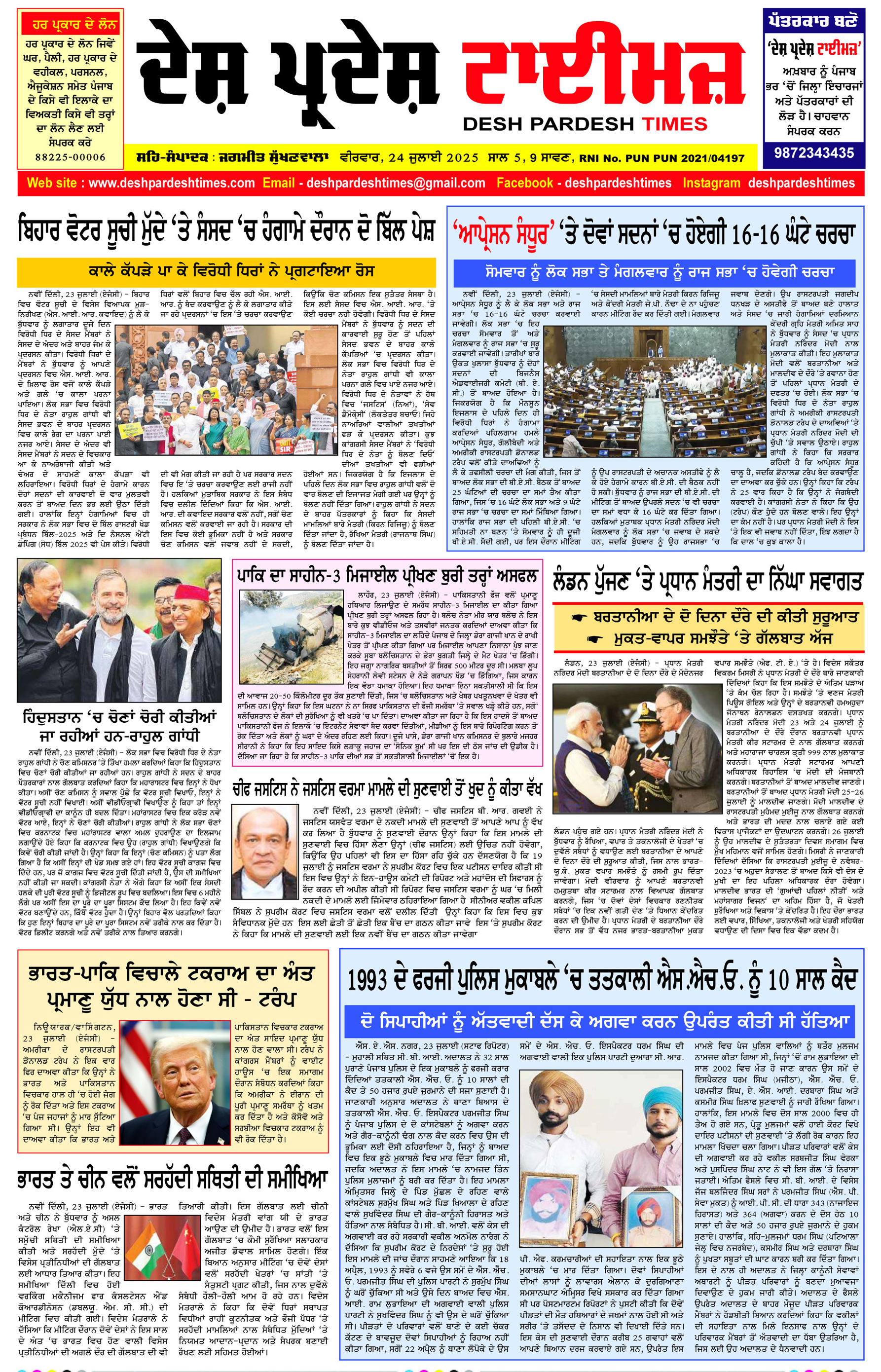 Desh Pardesh Times is a prominent Punjabi-language newspaper that was established in April 2002 to serve the growing Punjabi diaspora, particularly in Canada and the United States. Headquartered in Vancouver, British Columbia, the newspaper focuses on providing timely and relevant news that resonates with Punjabi-speaking communities abroad. Under the leadership of its founder and Editor-in-Chief Gurbhalinder Singh Sandhu, Desh Pardesh Times covers a wide range of topics including international and regional news, politics, culture, immigration updates, community events, and social issues affecting the diaspora. Its mission is rooted in preserving Punjabi culture and language while bridging the informational gap between Punjabis living overseas and those in India.