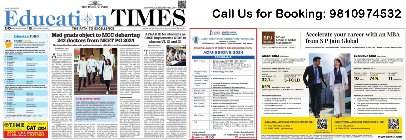 Choosing Education Times newspaper for advertisements offers a unique opportunity to target a highly relevant audience of students, parents, and educators who are actively seeking educational opportunities and information. Education Times provides a dedicated platform within The Times of India newspaper specifically tailored to cover topics related to education, including admissions, career guidance, and academic trends. By placing advertisements in Education Times, you can effectively reach this targeted audience and capture their attention while they are already engaged with educational content, maximizing the impact of your advertisement.