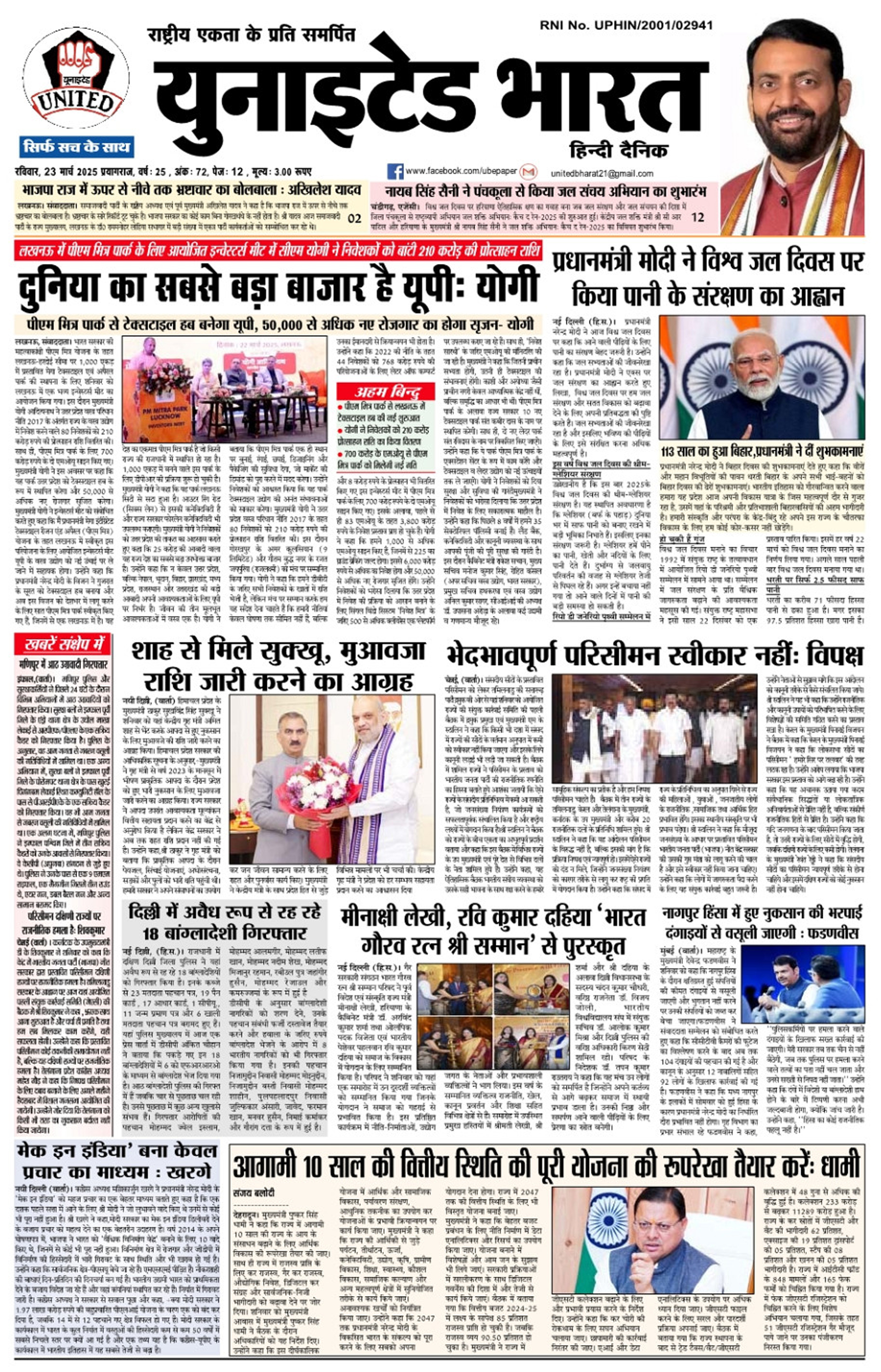 United Bharat is a prominent Hindi-language daily newspaper widely circulated in Northern India, particularly in Uttar Pradesh and neighboring regions. Known for its credible journalism and comprehensive news coverage, it serves as a vital source of information for Hindi-speaking communities. The newspaper covers a broad spectrum of topics, including local and national news, politics, social issues, business, sports, and entertainment. Its commitment to delivering accurate and timely news has earned it a loyal readership and a strong reputation in the regional media landscape.